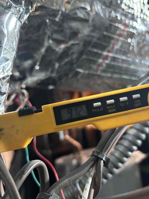 Completed Platinum Level maintenance on 6-year-old system with 20x20x5 filter. Performed electrical diagnostics using clamp meter, recording 58.8 amps on primary circuit. Secondary temperature readings measured at 41.1°F, confirming system is operating within manufacturer specifications.