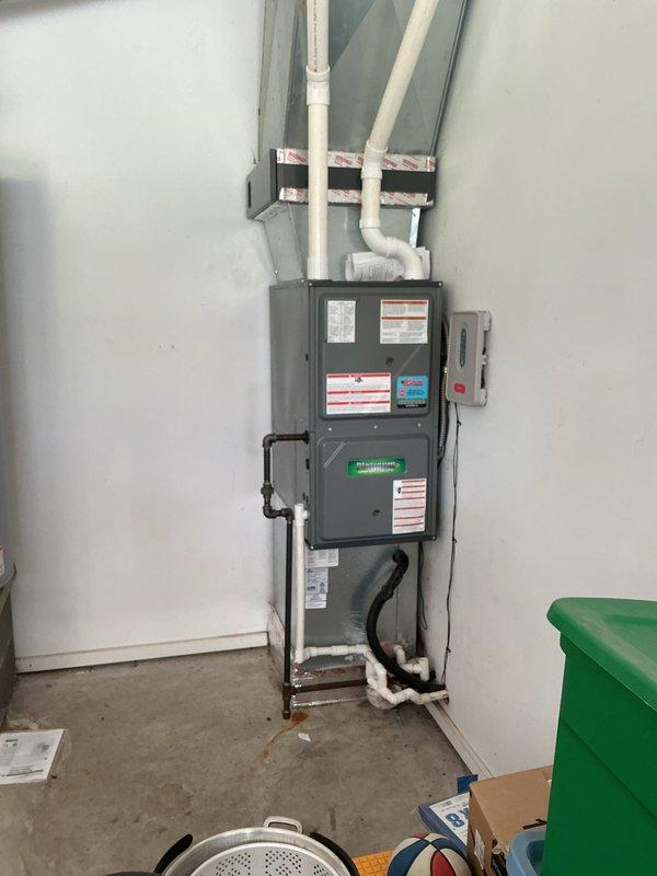 # HVAC Complete System Installation Successfully completed installation of a 1.5-ton, 14.7 SEER air conditioning system paired with a 97% AFUE upflow gas furnace in basement mechanical room. Removed existing equipment and installed new high-efficiency furnace unit with properly sized ductwork and plenum connections. Configured upflow orientation to accommodate basement installation with supply ductwork extending to upper levels through existing ceiling joists. Installed and connected new condensing unit for cooling system, ensuring proper refrigerant line routing and electrical connections. Integrated system controls and thermostat wiring for seamless operation between heating and cooling modes. Verified all ductwork connections were properly sealed and secured to metal plenum, ensuring efficient airflow distribution throughout the residence. Positioned equipment to maintain adequate clearance from existing water heater and utility infrastructure in the confined basement space. Rout