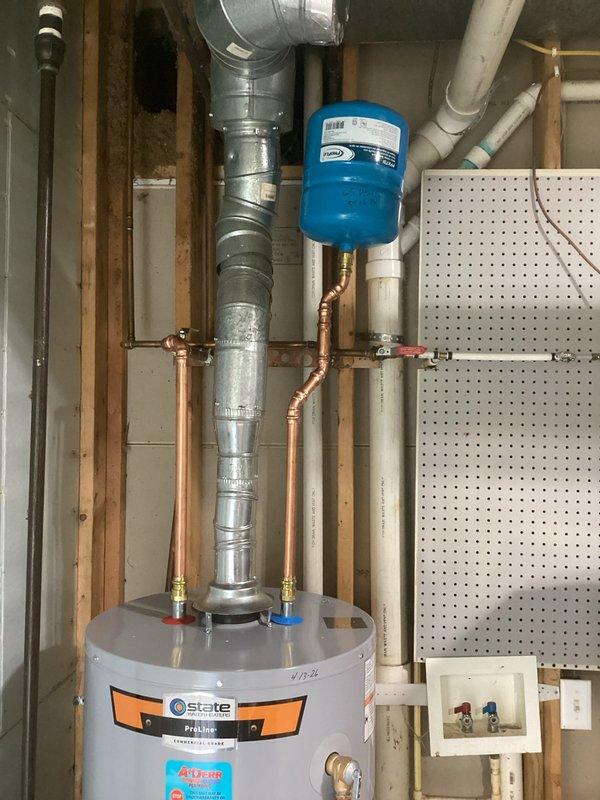 Completed installation of 50-gallon gas tall water heater (57 1/4" height x 22" width) in residential utility room with all required connections, shut-off valves, and pressure tank integration using copper piping and brass fittings. Additionally installed new outdoor spigot with dedicated waterline connected to existing drain system via pro-press copper connections, including new shut-off valve at spigot location and proper removal and disposal of old spigot. All plumbing connections tested and verified operational with no leaks detected.