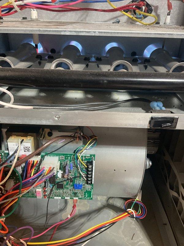 Diagnosed 5-year-old Trane HVAC system with complete non-operation and no airflow. Inspection revealed failed circuit board causing system failure. Replaced control board and verified proper system operation, restoring heat to downstairs zone.