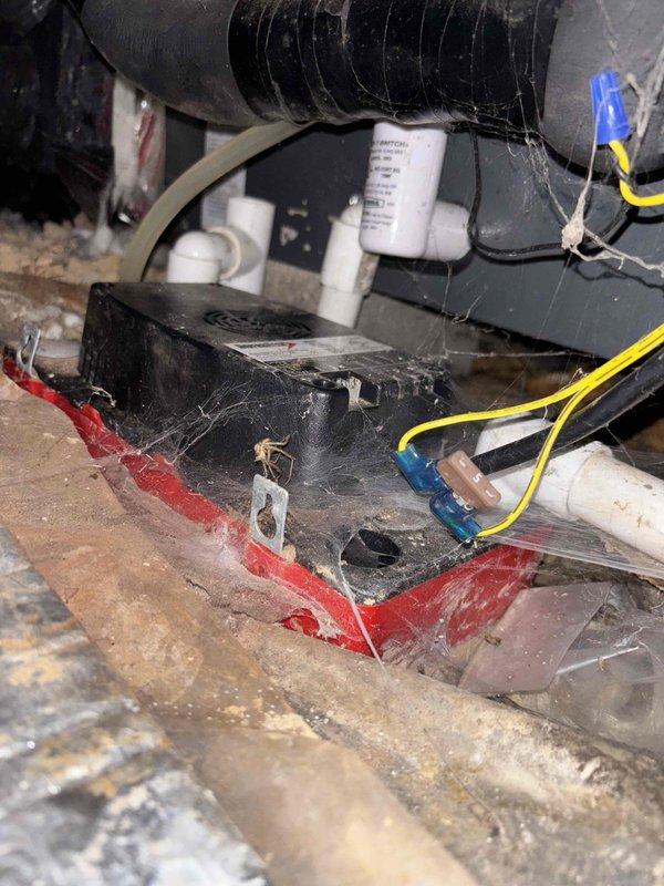Responded to no cooling call on 4-year-old system with no power to thermostat. Diagnosed failed condensate pump in crawlspace preventing system operation. Condensate pump requires replacement to restore cooling functionality; part ordered for follow-up installation estimated at 30 minutes.