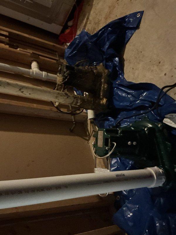 Inspected customer's downstairs bathroom with toilet backup issue and water accumulation around laundry room sump pump. Discovered severely corroded waste pipe connection causing system backup. Replaced deteriorated metal fitting with new PVC components to restore proper drainage function and prevent future overflows.