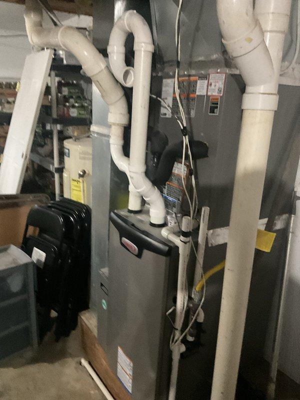 Completed planned maintenance visit on a 7-month-old Lennox furnace system with CFI filter. Inspected furnace unit, PVC ventilation components, and associated ductwork in basement utility area. System appears properly installed with appropriate exhaust configuration and electrical connections. No issues identified during this first annual maintenance service.