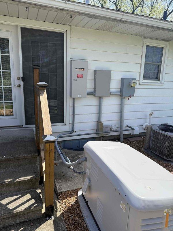 Successfully installed an 18kW Generac standby generator on a concrete pad adjacent to the existing HVAC equipment. Generator was properly mounted, connected to gas supply, and all electrical connections were completed with verification of proper flame combustion during operational testing.