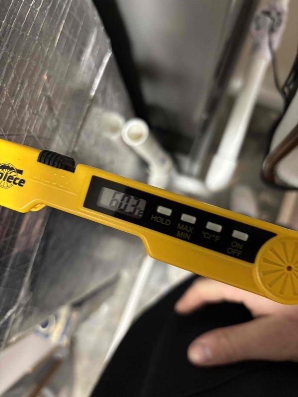 Completed follow-up inspection on basement air handler replacement. Performed temperature differential testing with Fieldpiece digital instrument, recording readings of 60.2 degrees across the system. All connections and ductwork appear properly installed with no visible issues.